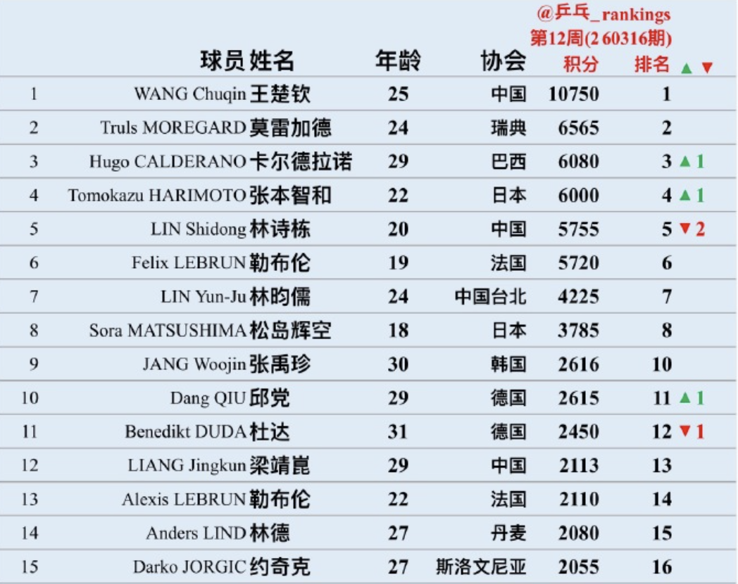 3月16日,随着重庆冠军赛的结束,WTT球员积分榜也随之发生变化。最新的积分榜上,20岁的林诗栋再降2名,来到世界第5位。1年前,他曾高居世界第1。